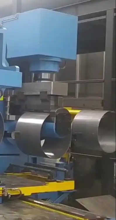 The Rerounder Unit is used to restore the roundness of the rim after the facing operation, which is done to prepare the rim for welding. This process facilitates rolling and calibrating operations. The Rerounder Unit is equipped with a hydraulic system and consists of the main unit, hydraulic unit, and electrical control panel.